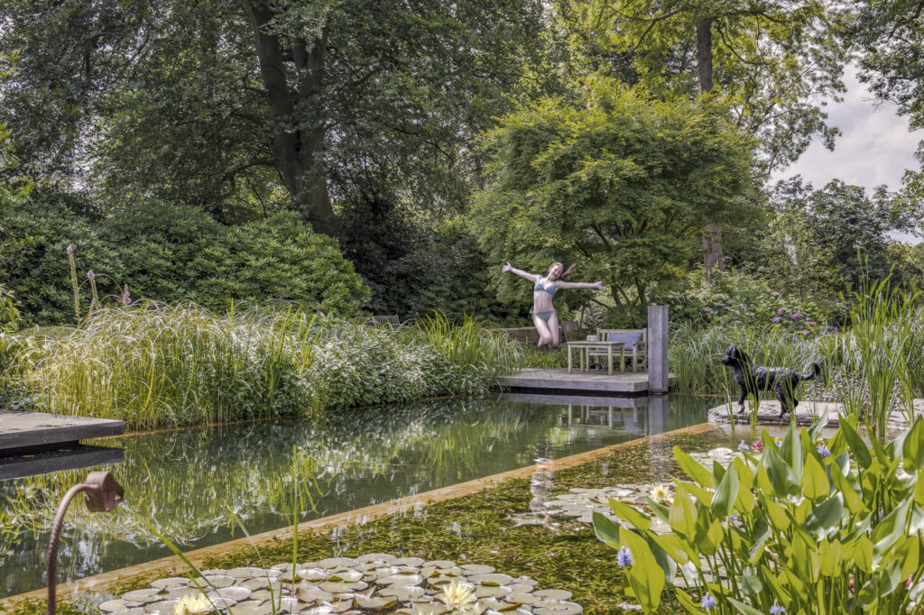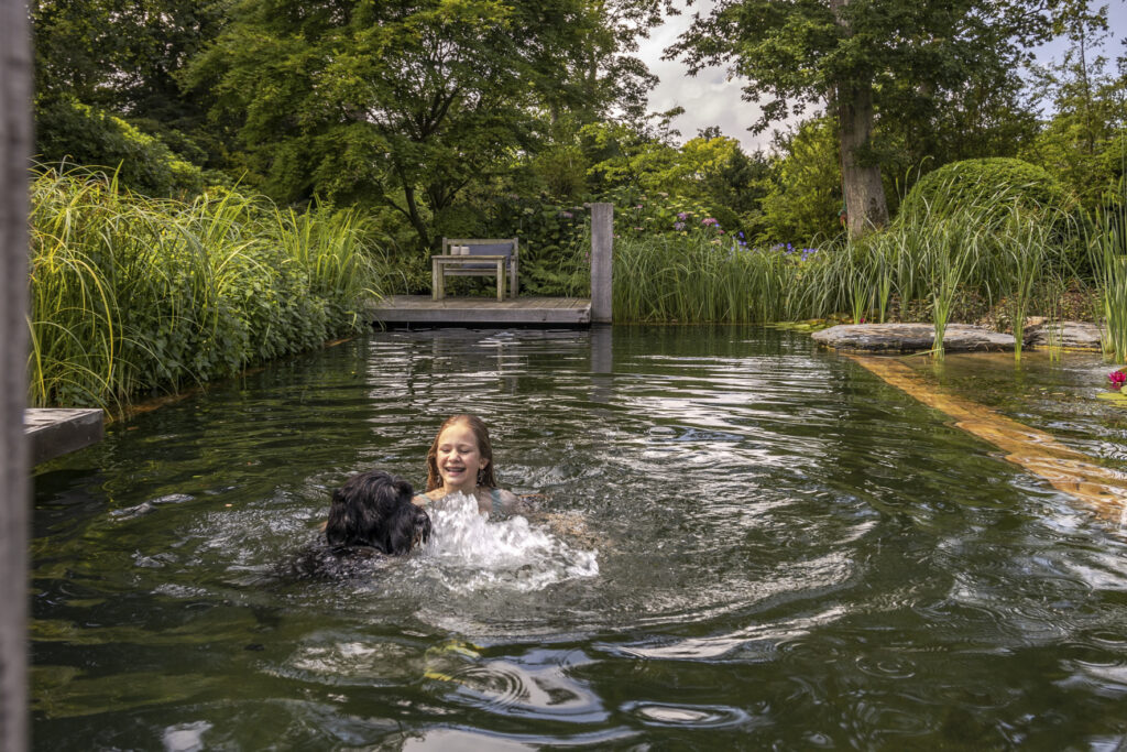 Inmiddels zwemt deze familie inclusief de Portugese Waterhond al drie jaar in deze natuurlijke zwemvijver en ze vinden het helemaal fantastisch! De klant vertelt vol enthousiasme hoe de kinderen rondrennen bij de waterplas en hoe de hond meedoet met alle spellen in en rondom deze natuurlijke zwemplek.